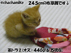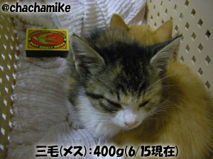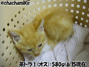 ・・・・当たり前ですが、姉にめっさ怒られました。 ちなみに母ンはしばらくボー然としてました。 わかってますよ・・・自分がどれだけ安易なことをしたかなんて・・・ 我が家にはもうネコ1匹(成猫)がいるのです・・・私が一番世話をしているからか、私に一番懐いているカンワイ~~~~子がッ!!(><;)(←親バカ) でも!!3匹とも目ヤニが付いてたのでどうしてもほっとけなかったんだよ~~~~っ!!! しかも初めて会う人間(私)がエサをチラつかせただけでホイホイ寄ってくるくらい無防備な子達で、捕まえるのめっさ簡単でした。 あ、一応他に子猫2匹+母猫もいましたが、警戒心が強く近寄ってきませんでした。ん~可哀想だが、こ、今回は見逃がしてやるっ!!(どっかの下っ端風) と、いうことで 里親さん募集します!! と、いうことで今回は 我が家の先住猫(さのすけ)にもヒョコヒョコ近づいていきます。 ただし先住猫が激しい人(猫?)見知りのため、茶トラ②追いかける→先住猫逃げる→茶トラ②追いかける→の繰り返し。 ・・・・くうっ!!母は情けないぞ!!!(T□T;) ですが3匹共通は皆結膜炎になってます(ノдT;) 特に<茶トラ②>が重症です。 獣医さんに3匹を見てもらった時、「癒着しかかってるね~」と恐ろしいことをさらっと言われてしまいました。 とりあえず目薬をさしながら、ウン○を回収して、寄生虫がいるか検査してもらわなくては・・・っ!!(混乱中) 忍者ブログ [PR]